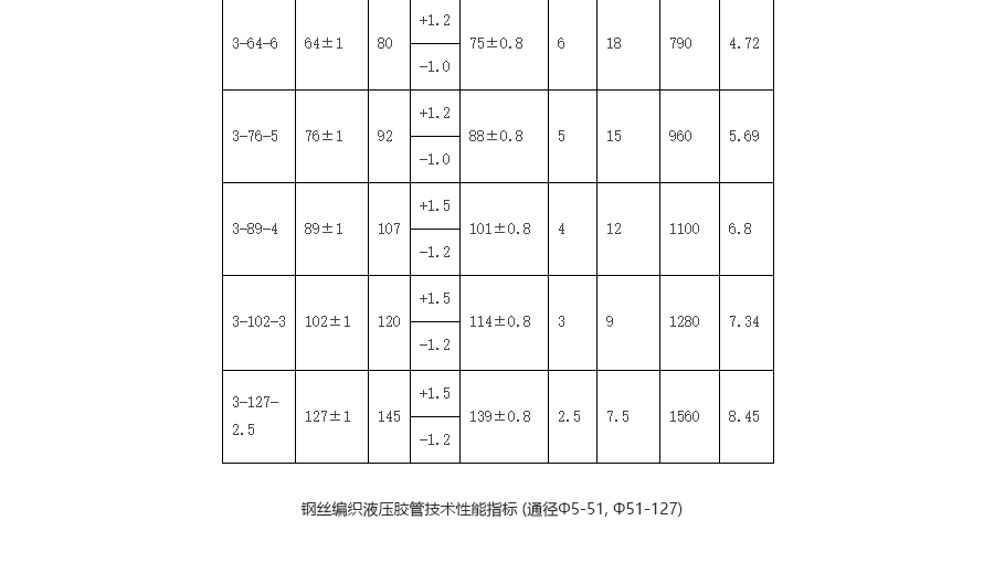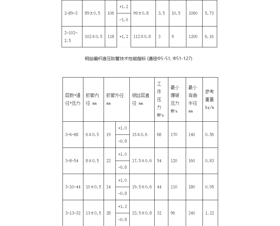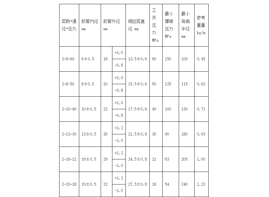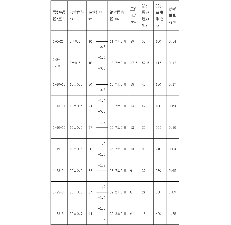 一、鋼絲編織膠管結構是由耐液體的合成橡膠內膠層、中膠層、Ⅰ或Ⅱ或Ⅲ層鋼絲編織增強層、及耐天候性能優良的合成橡膠外膠層組成。