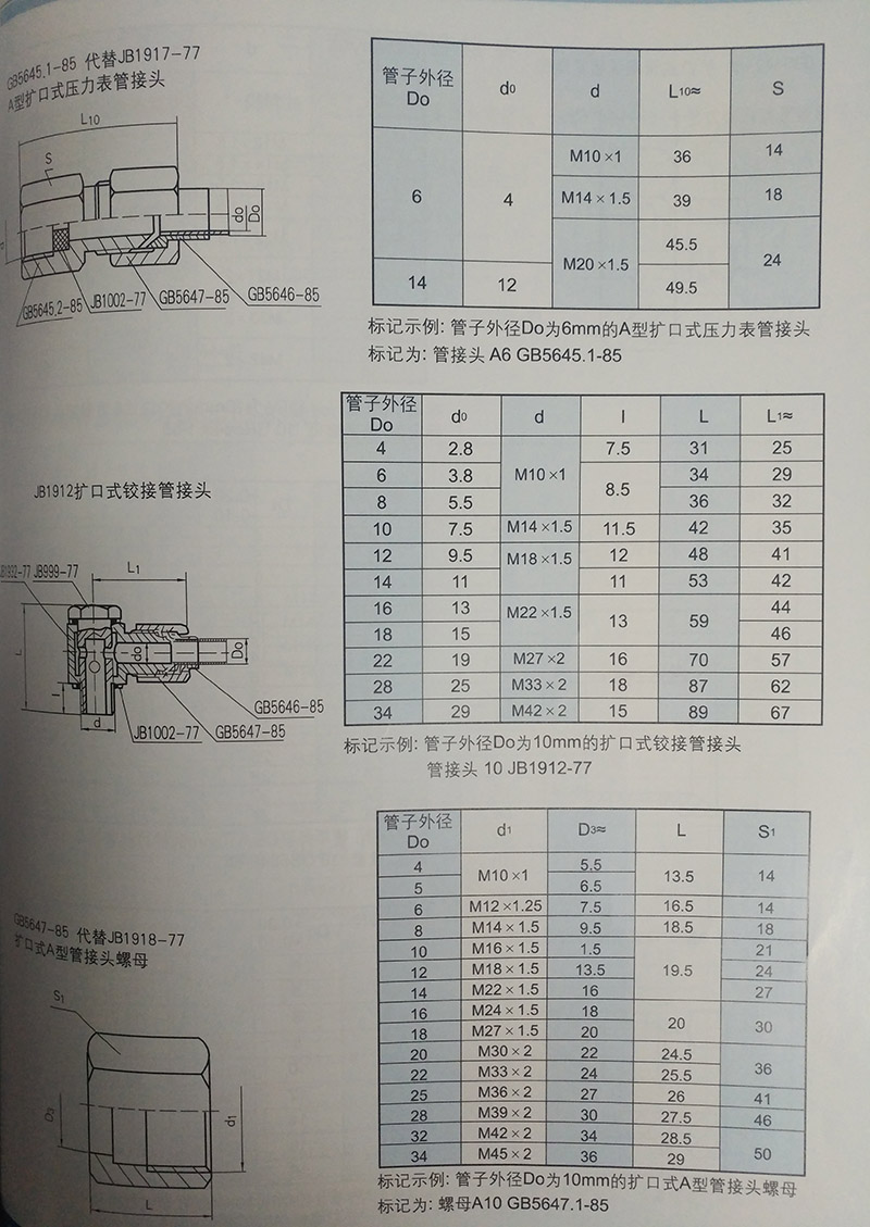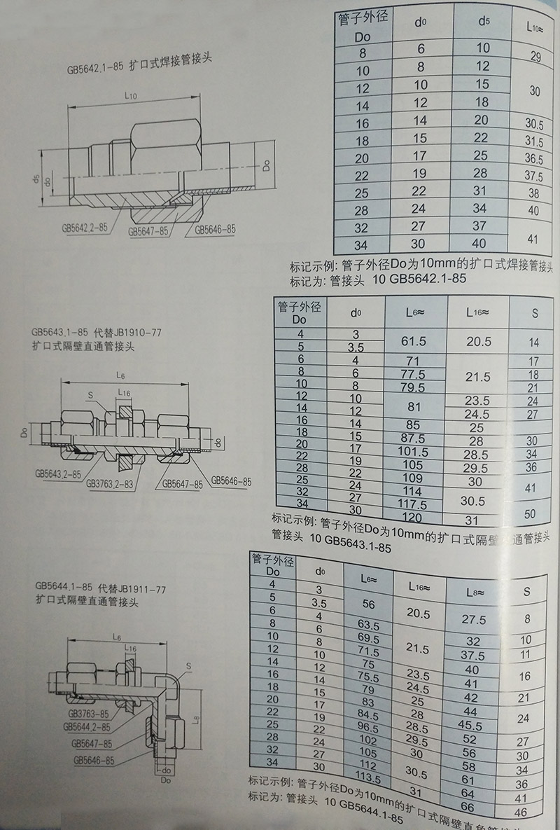 擴口式管接頭適用介質:油、水、氣等非腐蝕性或腐蝕性介質管接頭(其中具有代表性的制造商有上海通陽管件有限公司),配用鋼管的規格要求比較靈活,與管道焊接后,具有連接牢靠、密封性能好等特點,因而在煉油、化工、輕工、紡織、國防、冶金、航空、船舶等系統中被廣泛采用;也適用于各種機械工程、機床設備等液壓傳動管路。 擴口式管接頭制造標準